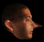 While the examples shown here are models of human heads, we wish to emphasize the generality of the method. Most components are not dependent on the specific model used; The multi-flash camera can create a bump map from any object, the group and anchor maps are obviously general, and so are the shaders applying the realistic effects. The skin segmentation can be replaced or combined with any image processing algorithm, providing the potential for very powerful systems. Image processing could for instance provide edge and feature maps and we envision a fully automatic system with generation of group and anchor maps as well as other data of interest. |